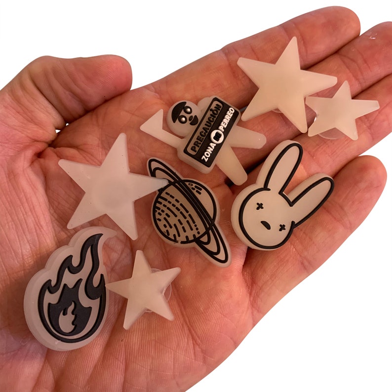 PREORDER Bad Bunny Croc Charm Set | Etsy from i.etsystatic.com Bad bunny has proved many times that he's a crocs fan, flaunting his pair of foam clog shoes on stage and in tv appearances. Great for stocking stuffers or a bad bunny fan. They do glow in the dark. High quality bad bunny gifts and merchandise. High quality reproduction bad bunny croc jibbitz charms this listing is for a set of 8 glow in the dark charms. The shoes are classic crocs clogs decked out with an exclusive bad bunny jibbitz charm. More stuff is going to be coming out to bundle soon. The bad bunny croc charms are as follows: