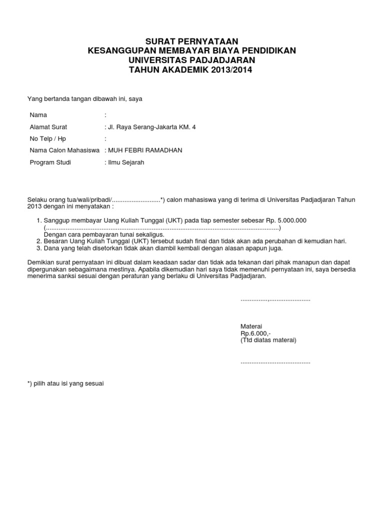 Saya akan membayar biaya pendidikan sesuai dengan jadwal pembayaran yang telah. Demikan surat pernyataan kesanggupan ini saya buat agar dapat dipergunakan sebagaimana mestinya. Apabila kami tidak sanggup memenuhi pernyataan tersebut di atas, sekolah tinggi multi. Surat pernyataan kesanggupan biaya pendidikan. Surat ini juga nanti akan dijadikan sebagai bukti kuat ketika salah satu pihak lupa terhadap isi dari surat ini.