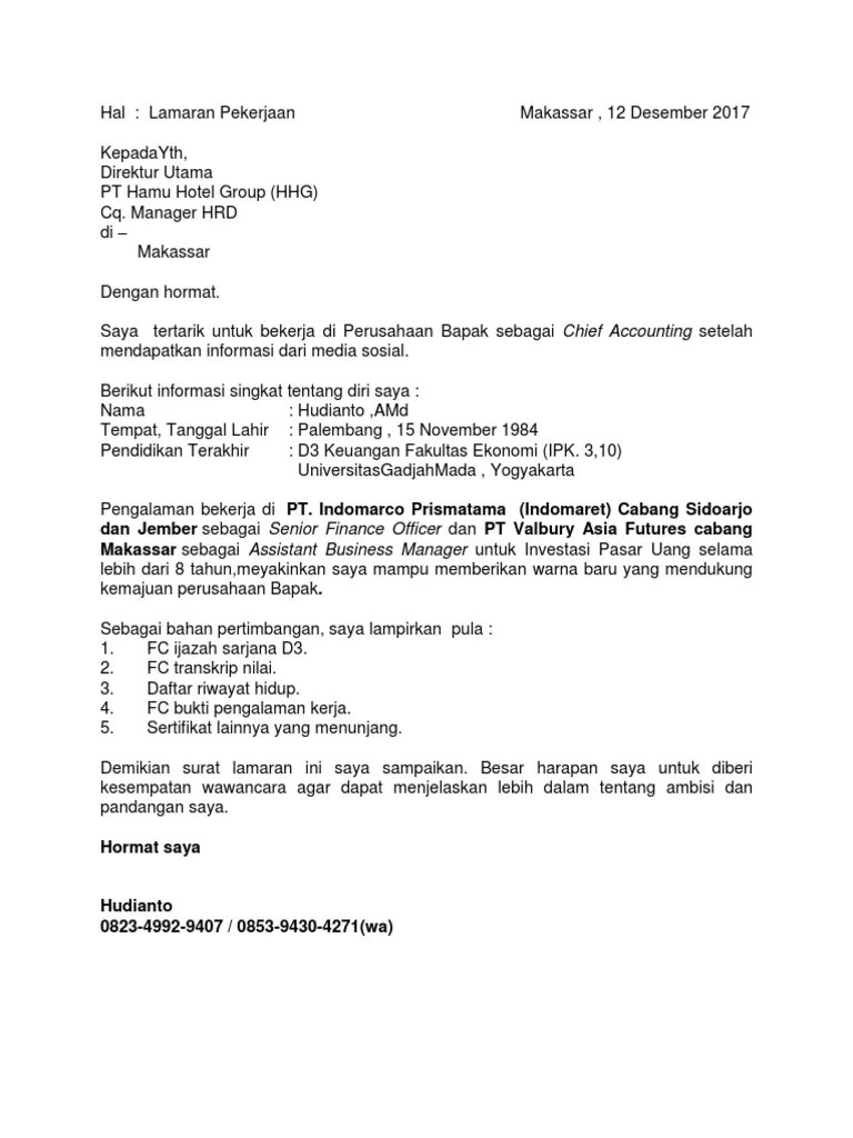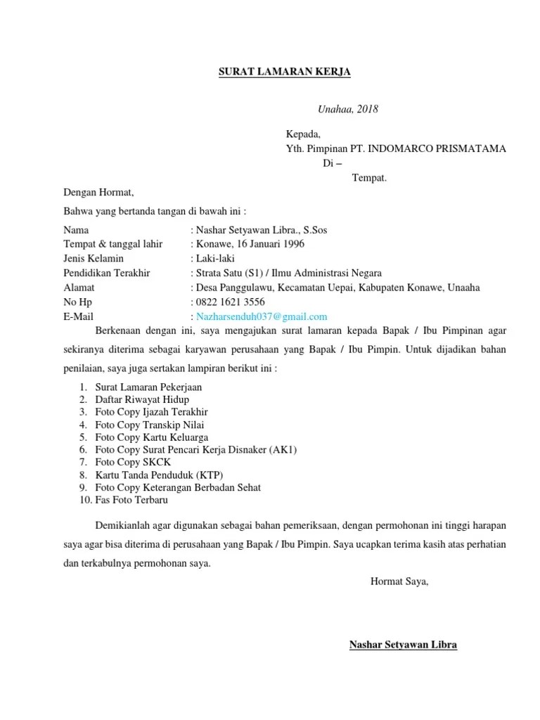 Bapak sebastianus manager hrd pt. Yang dimaksud dengan surat lamaran kerja indomarco adalah surat yang dibuat dan diajukan oleh seseorang dengan maksud untuk mengajukan diri atau melamar pekerjaan di pt di indomarco prismatama. Misalnya surat lamaran kerja untuk menjadi karyawan atau menjabat pada jabatan tertentu, sesuai dengan iklan yang ditawarkan. Berdasarkan informasi yang saya terima dari iklan lowongan kerja bahwa pt indomarco prismatama sedang membutuhkan karyawan untuk posisi pramuniaga. Demikian surat lamaran kerja yang saya ajukan, besar harapan saya dapat kesempatan untuk diwawancarai dan bergabung di perusahaan bapak/ibu pimpin.